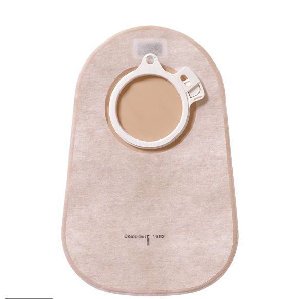 A bolsa coletora pode ser removida da base com adesivo espiral, permitindo que ela possa ser trocada mais frequentemente do que a base adesiva.