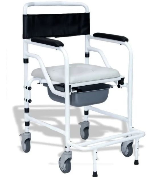 Braços fixos e apoio de pés com antitombo para garantir conforto e segurança ao usuário.