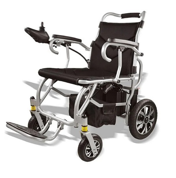 A Cadeira de rodas motorizada compact chair é composta por quadro, quatro rodas, assento e encosto, manopla única, par de baterias, motor, apoios de braços, apoios para pés e joystick.