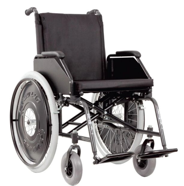 Rodas traseira de 24” com raios reforçados, pneus infláveis, aro de impulsão em aço de carbono, cubos em alumínio montados com rolamentos blindados;