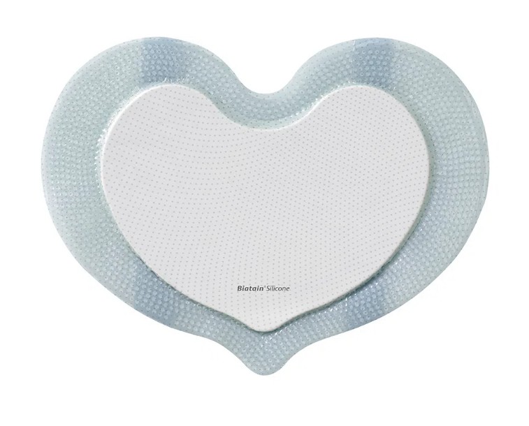 Biatain® Silicone é um curativo de espuma de poliuretano macio e adaptável com uma película superior semipermeável, resistente à água e bactérias, e um adesivo de silicone macio