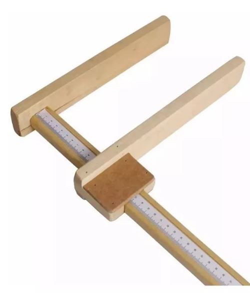 Haste de madeira principal medindo 17mm X 25mm X 1080mm, com haste de madeira parafusada em uma extremidade para encosto de cabeça, com furo passante para cordão em outra extremidade para travamento do cursor; com fita de escala métrica em milímetros com números destacados a cada centímetro na posição horizontal, medindo até 1 metro - não auferida;